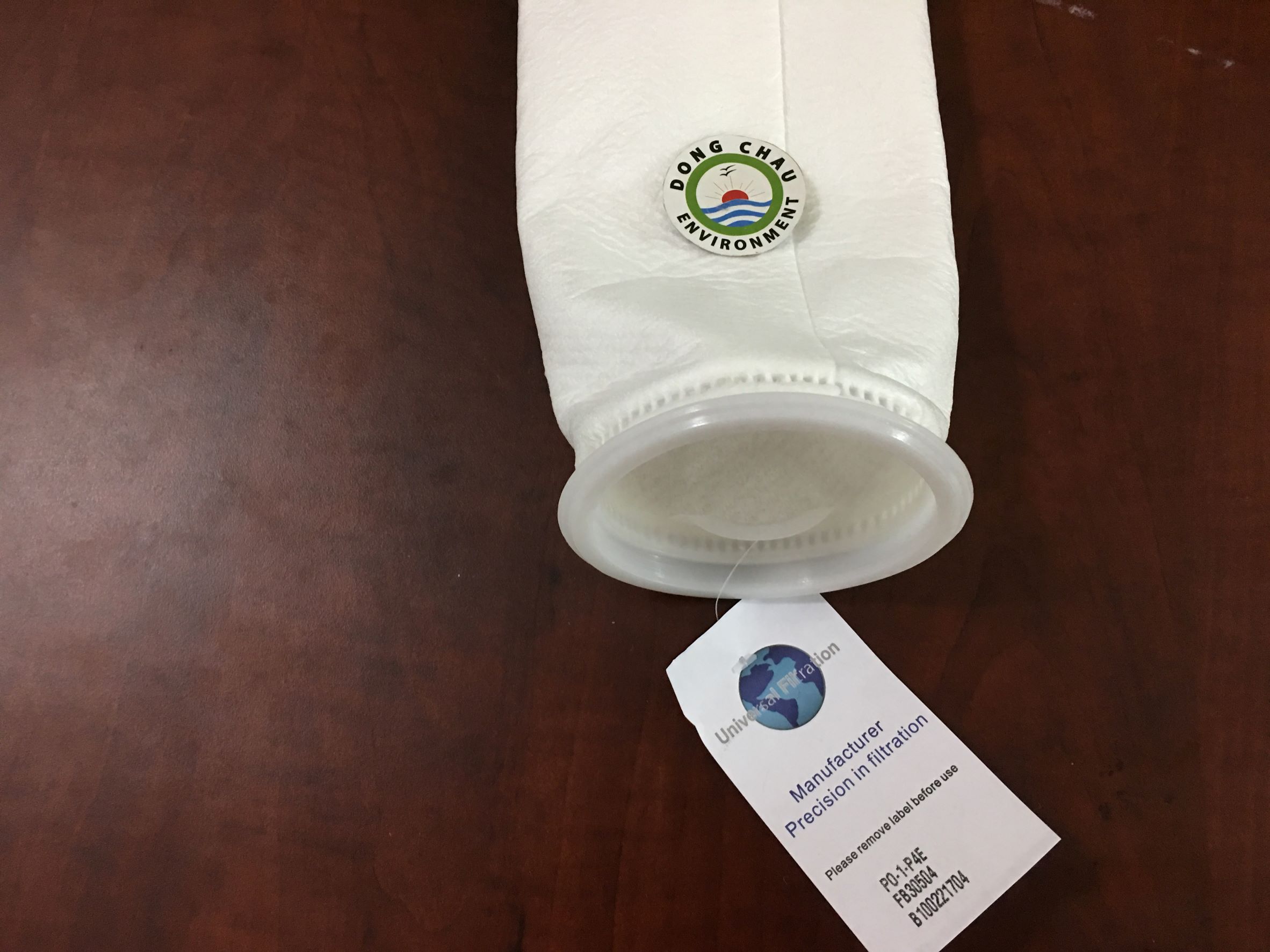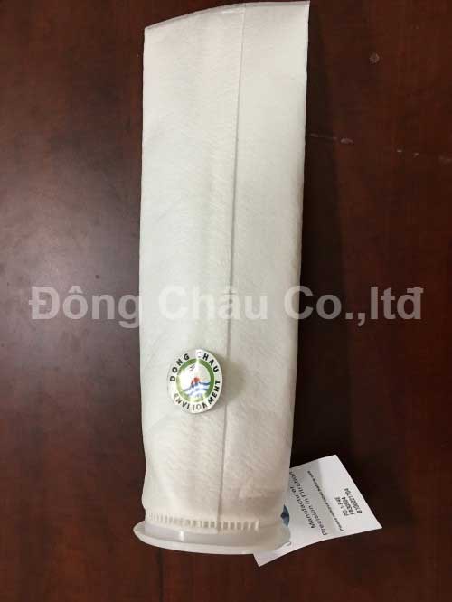 Túi lọc PP hình trụ tròn dài làm bằng Polypropylen, với miệng nhựa nối với túi bằng quá trình ép nhiệt.